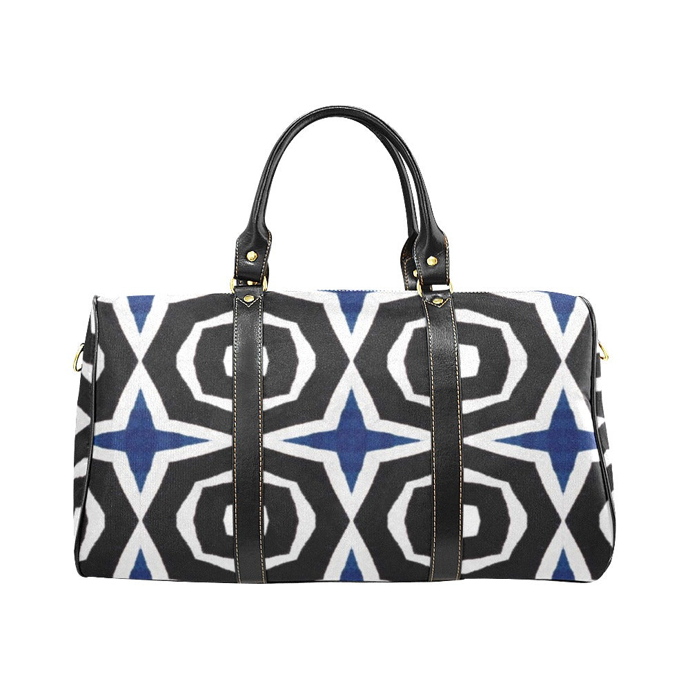 Bold. Balanced. Unmistakably elegant. The Midnight Voyage Tote embodies strength and sophistication with its geometric black-and-blue pattern and sleek faux-leather details. Designed for the modern traveler, it offers both style and substance — from airport lounges to weekend getaways.